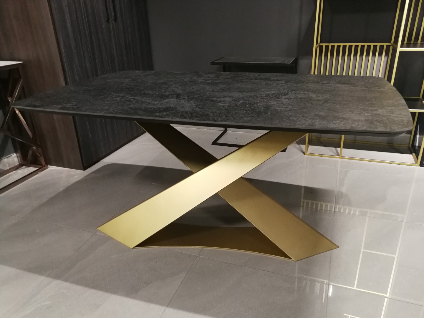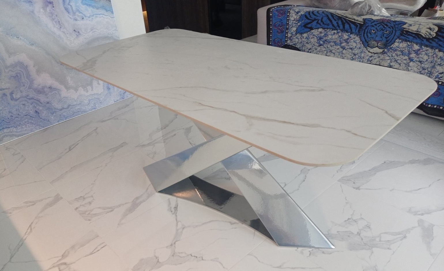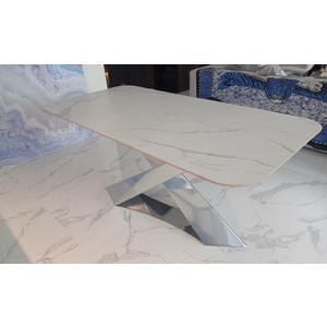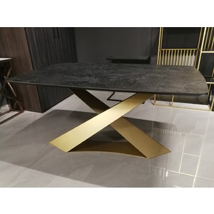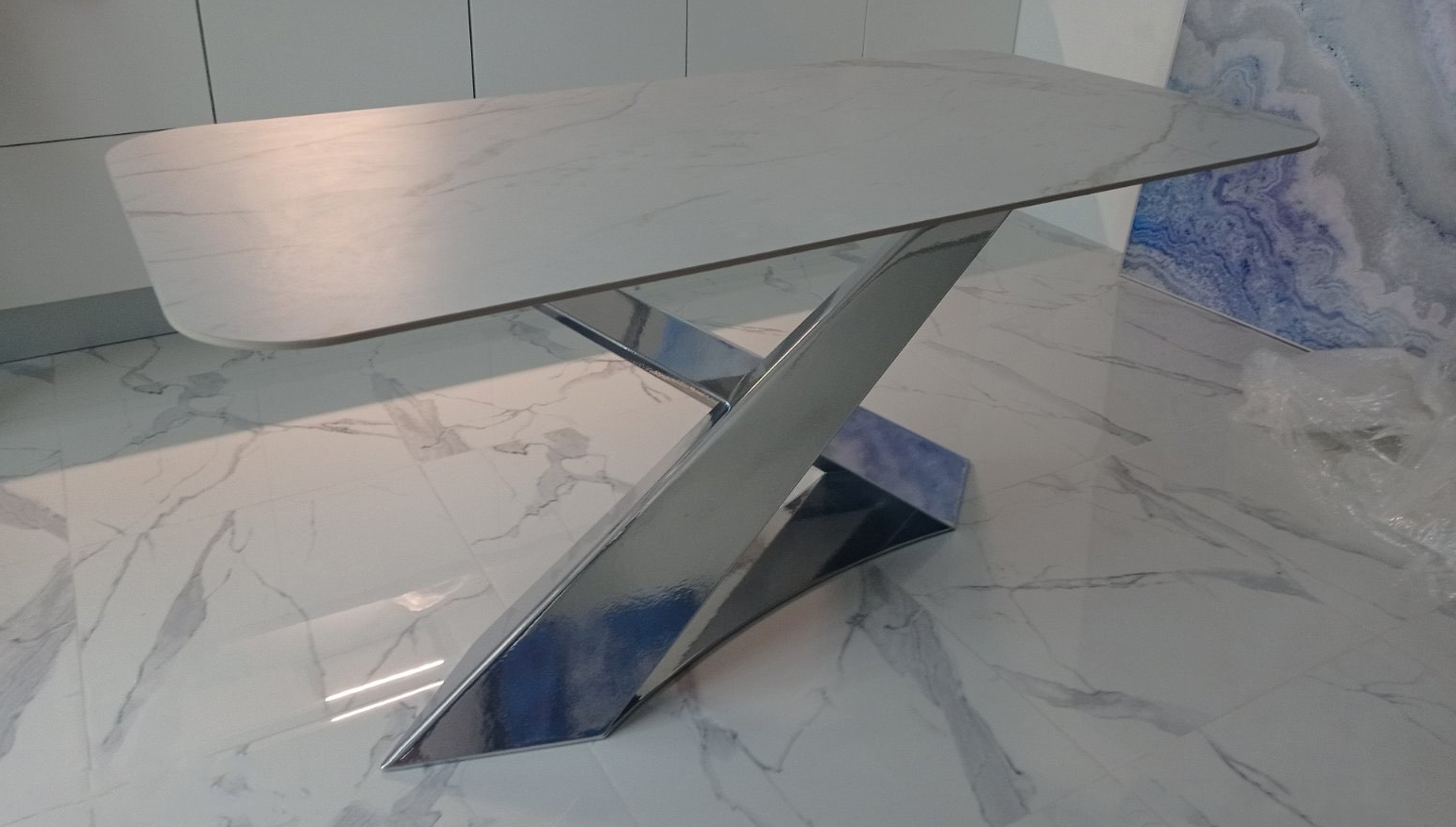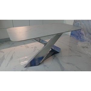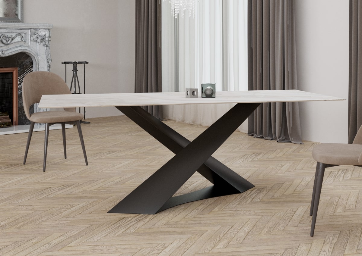 Подстолье дизайнерское "CHAMELEON на подиуме" представляет собой подстолье с двумя наклонными ножками, расположенными асимметрично внахлест из металла, стоящая на металлической подставке. Смелый и впечатляющий дизайн в итальянском стиле. Изменяет свою форму в зависимости от угла обзора. Позволяет удобно расположиться каждому за столом.